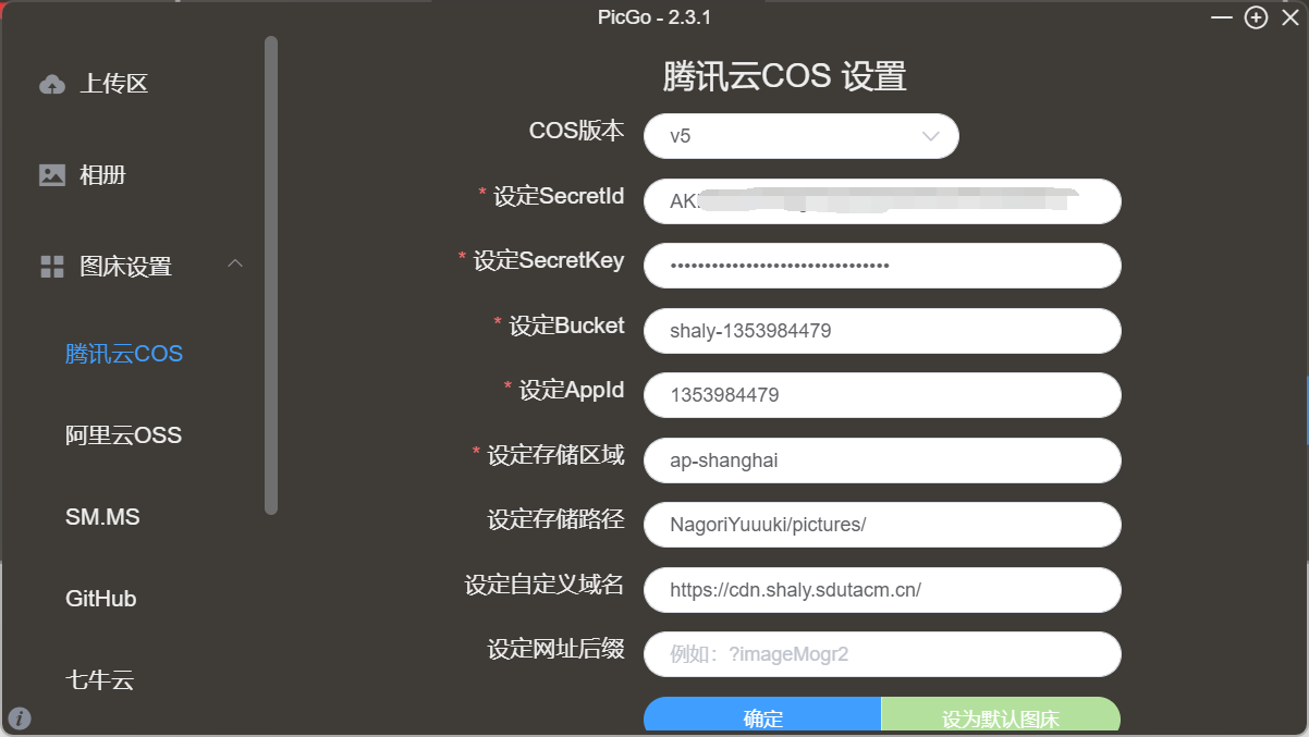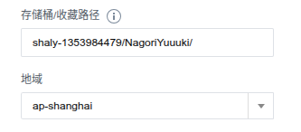 设定存储路径 填写 存储桶/收藏路径 中,shaly-1353984479 之后的部分,每人不同,在本例中为 NagoriYuuuki